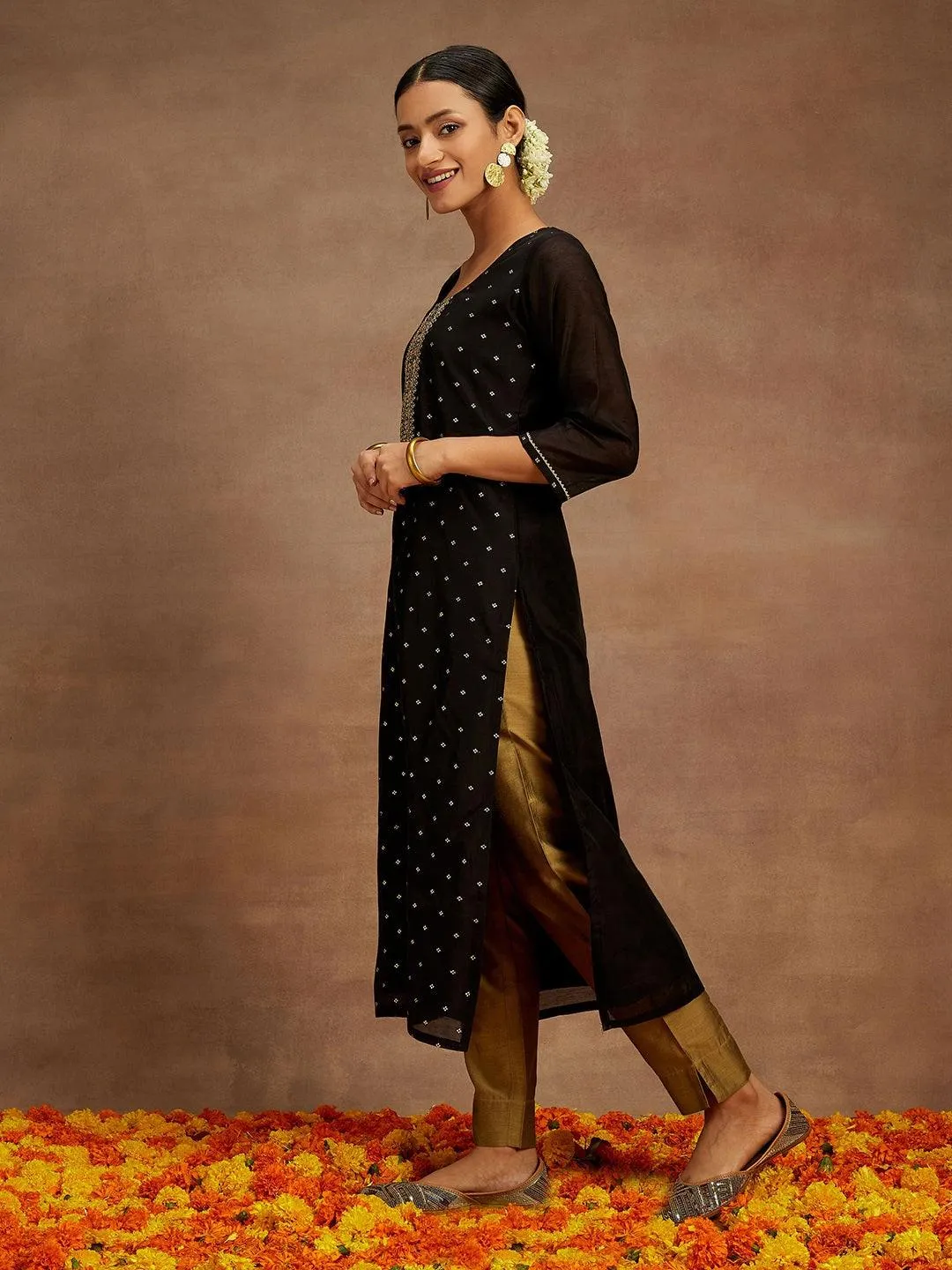 Black Woven Design Chanderi Silk Straight Kurta