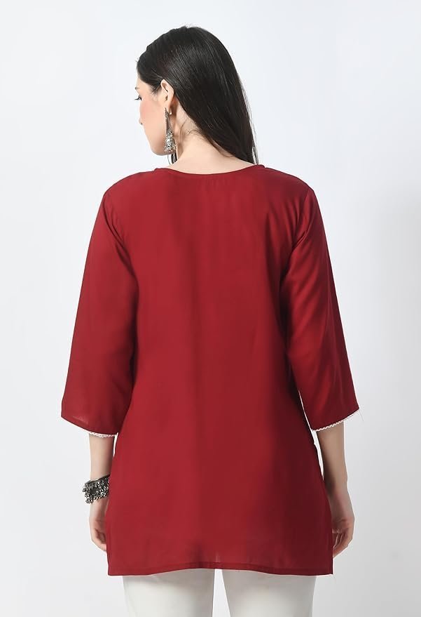 Kurti for Women – Short Chikankari Kurtis for Girls, Lakhnawi Tunic Top Kurta Design for Ladies, Woman Ethnic Kurthis & Shirt with Sleeve, Plain Straight Embroidery for Office