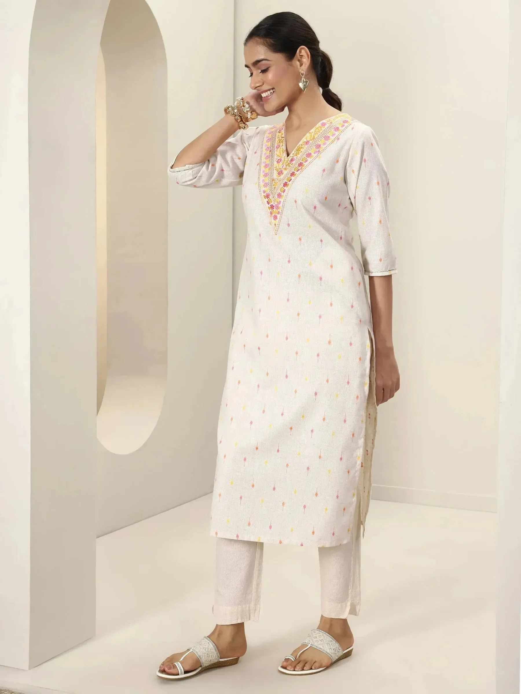 Off White Embroidered Cotton Straight Kurta